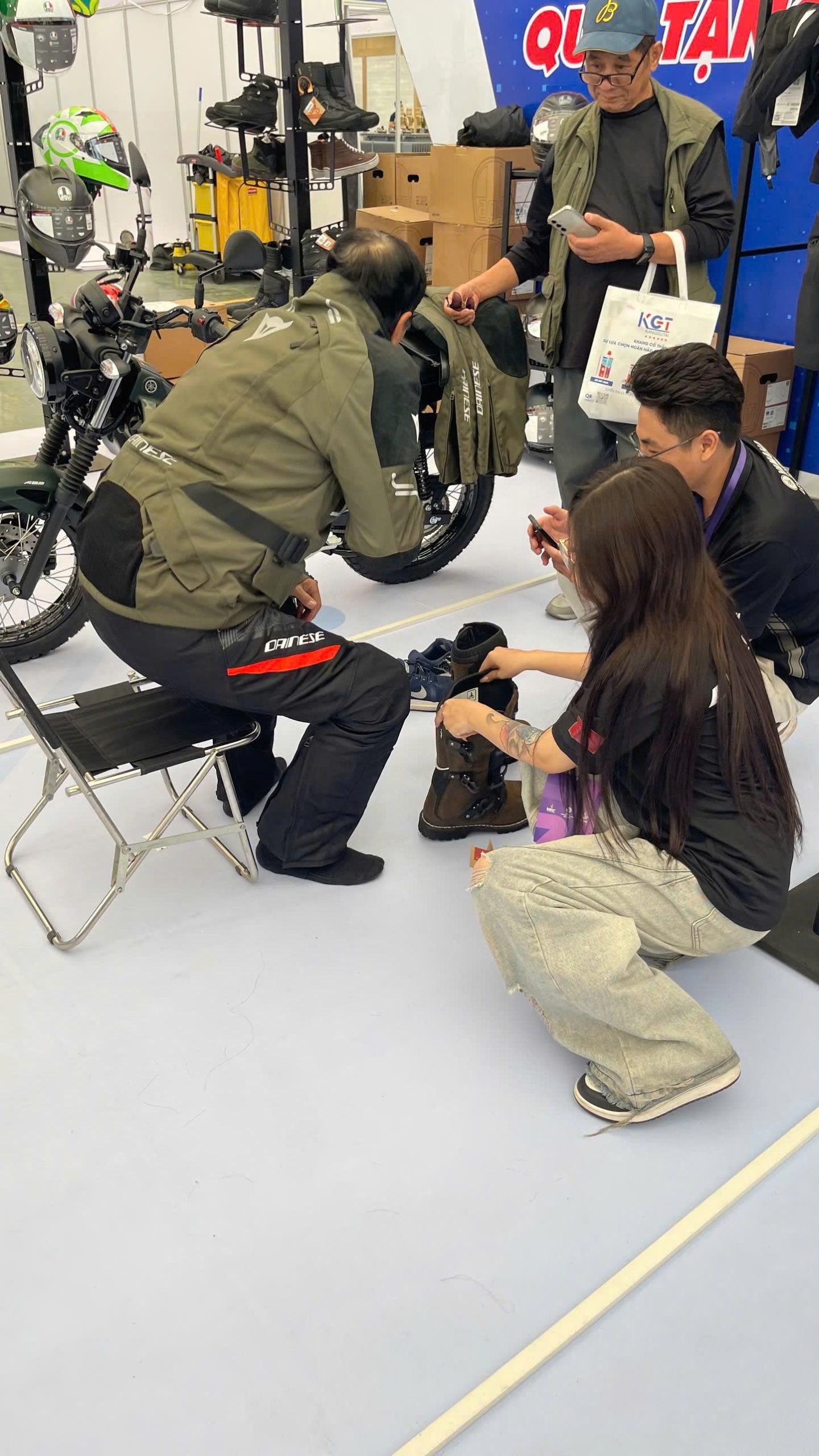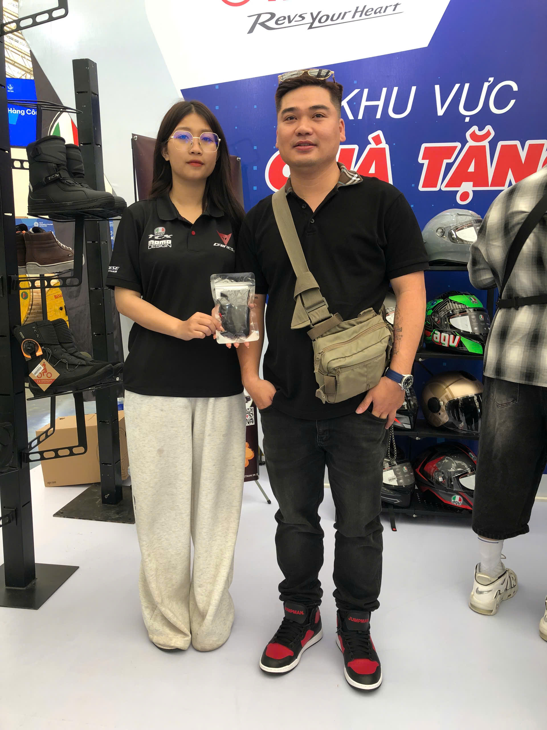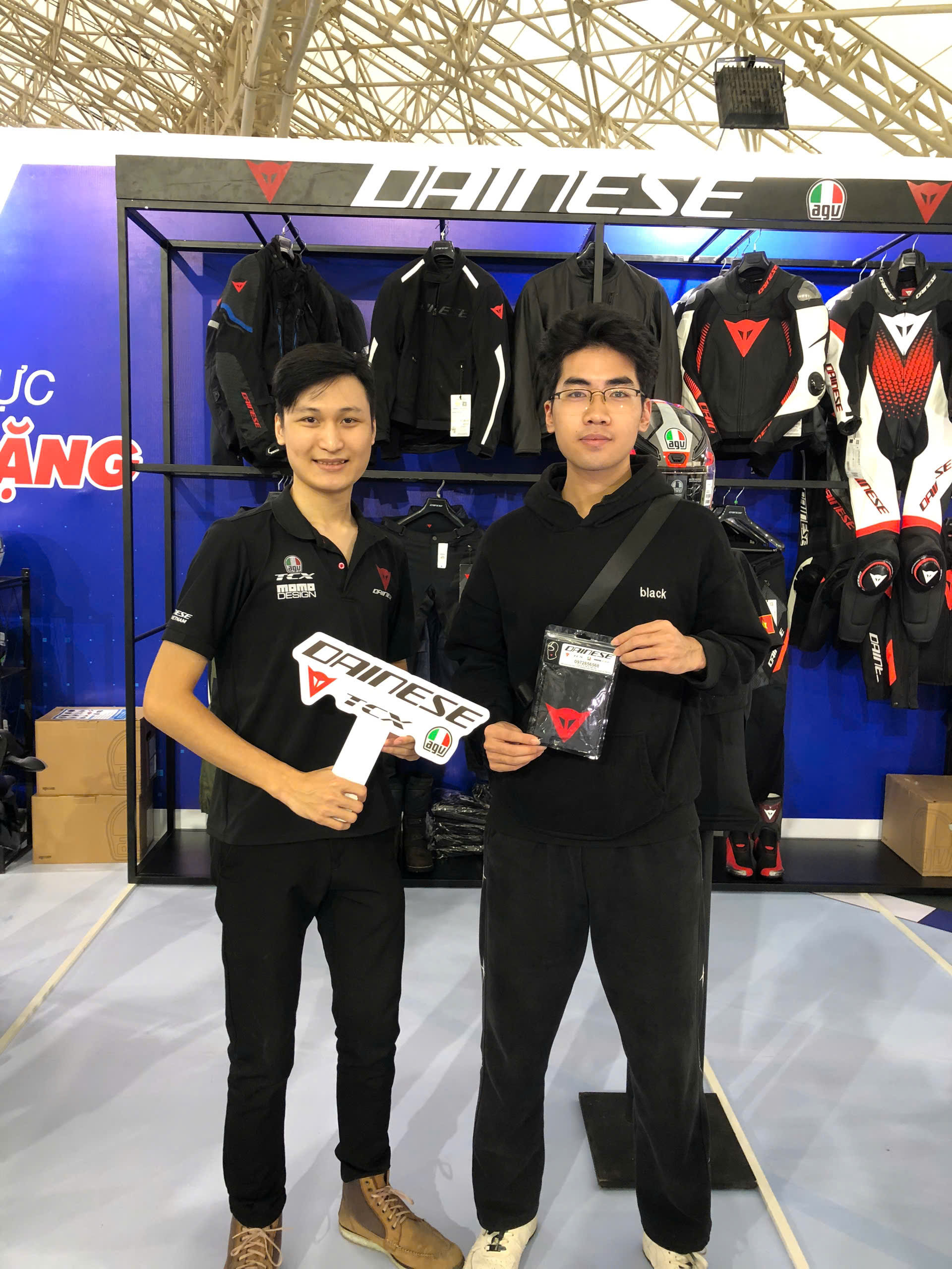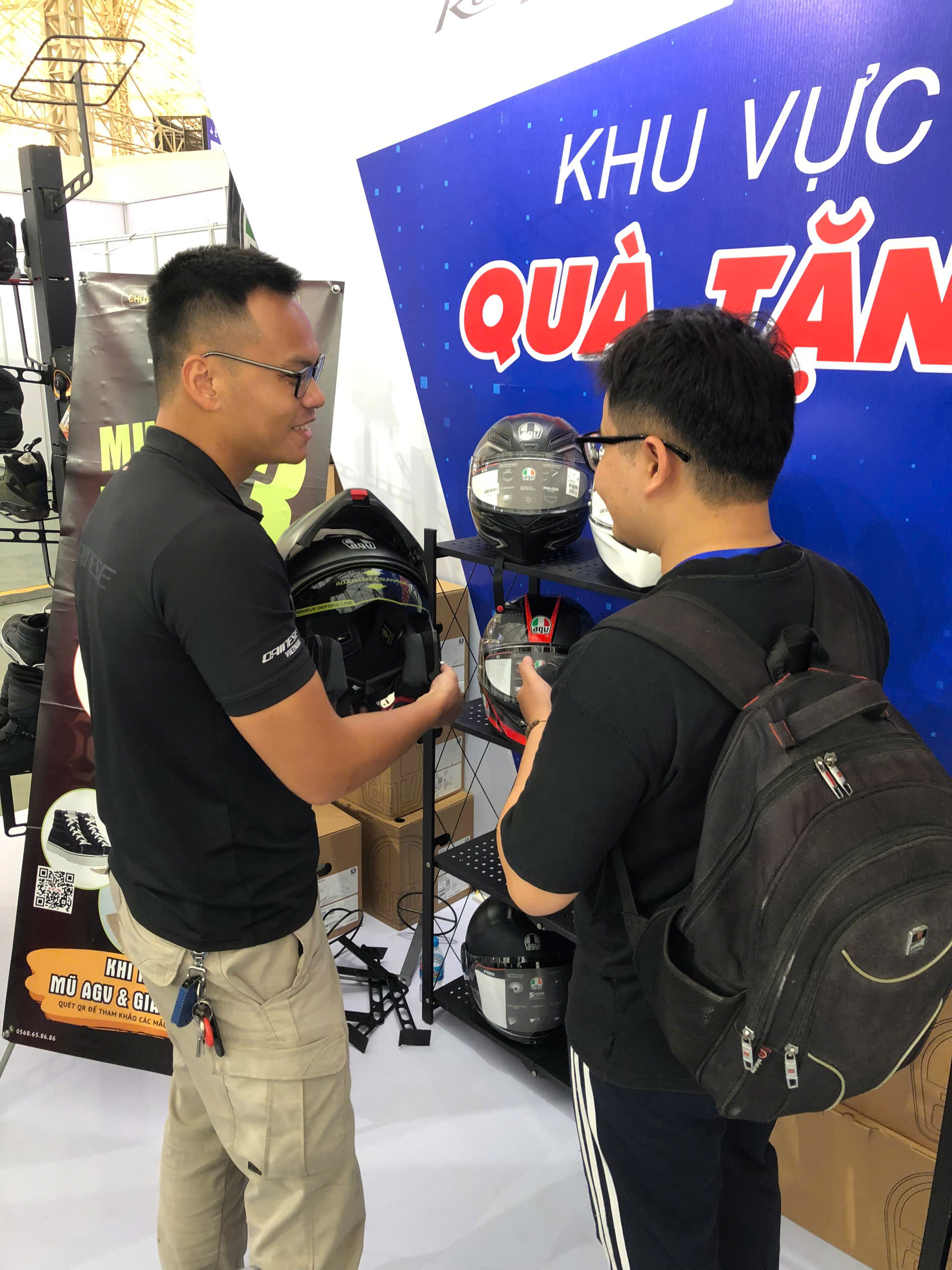 Khách ghé gian hàng Dainese – AGV – TCX nhận được nhiều phần quà lưu niệm như lời tri ân từ nhà phân phối chính hãng. Sự hào hứng của khách khi nhận quà, thử sản phẩm và chụp ảnh tại booth tạo nên bầu không khí sôi nổi xuyên suốt các ngày triển lãm.