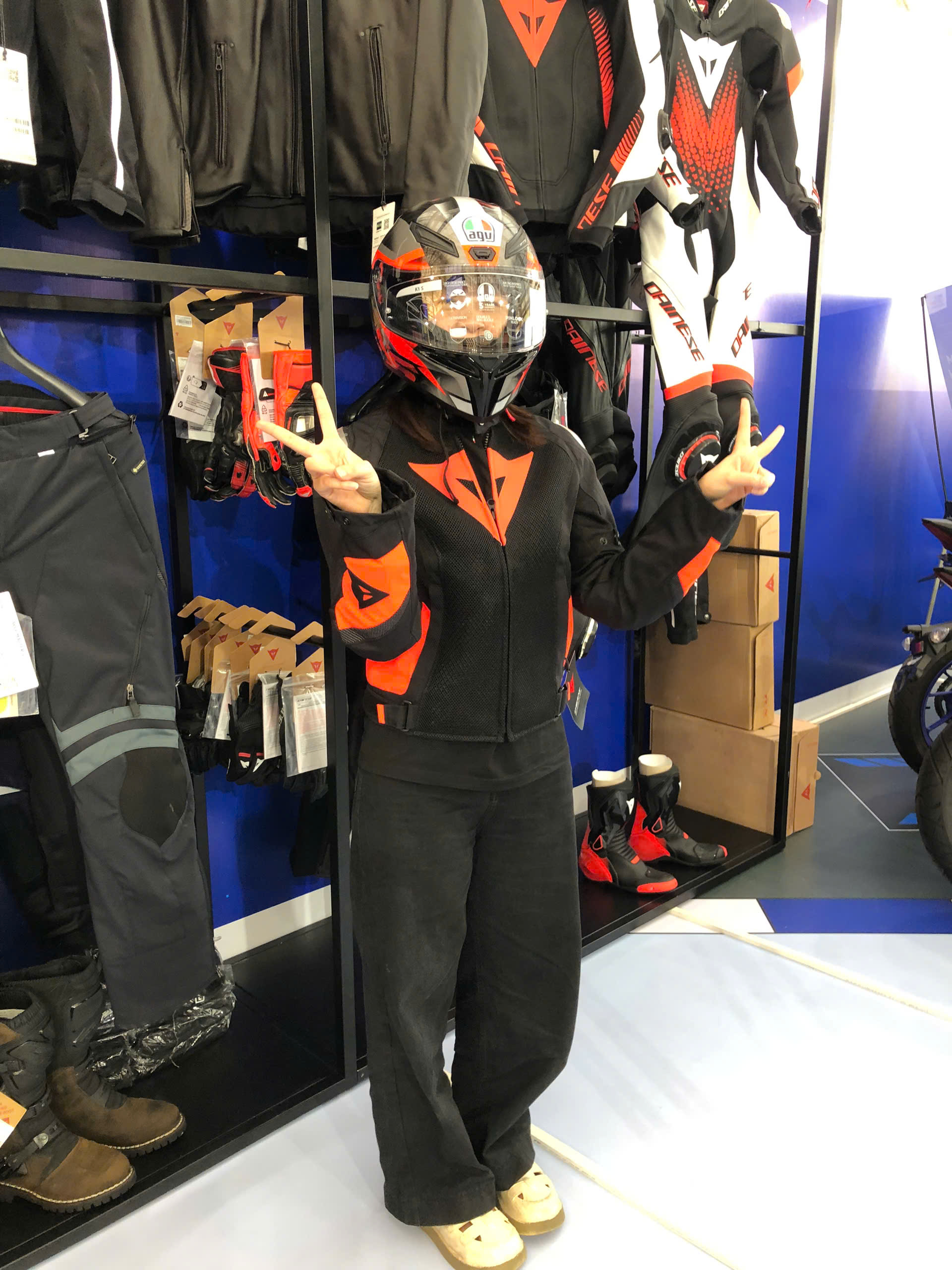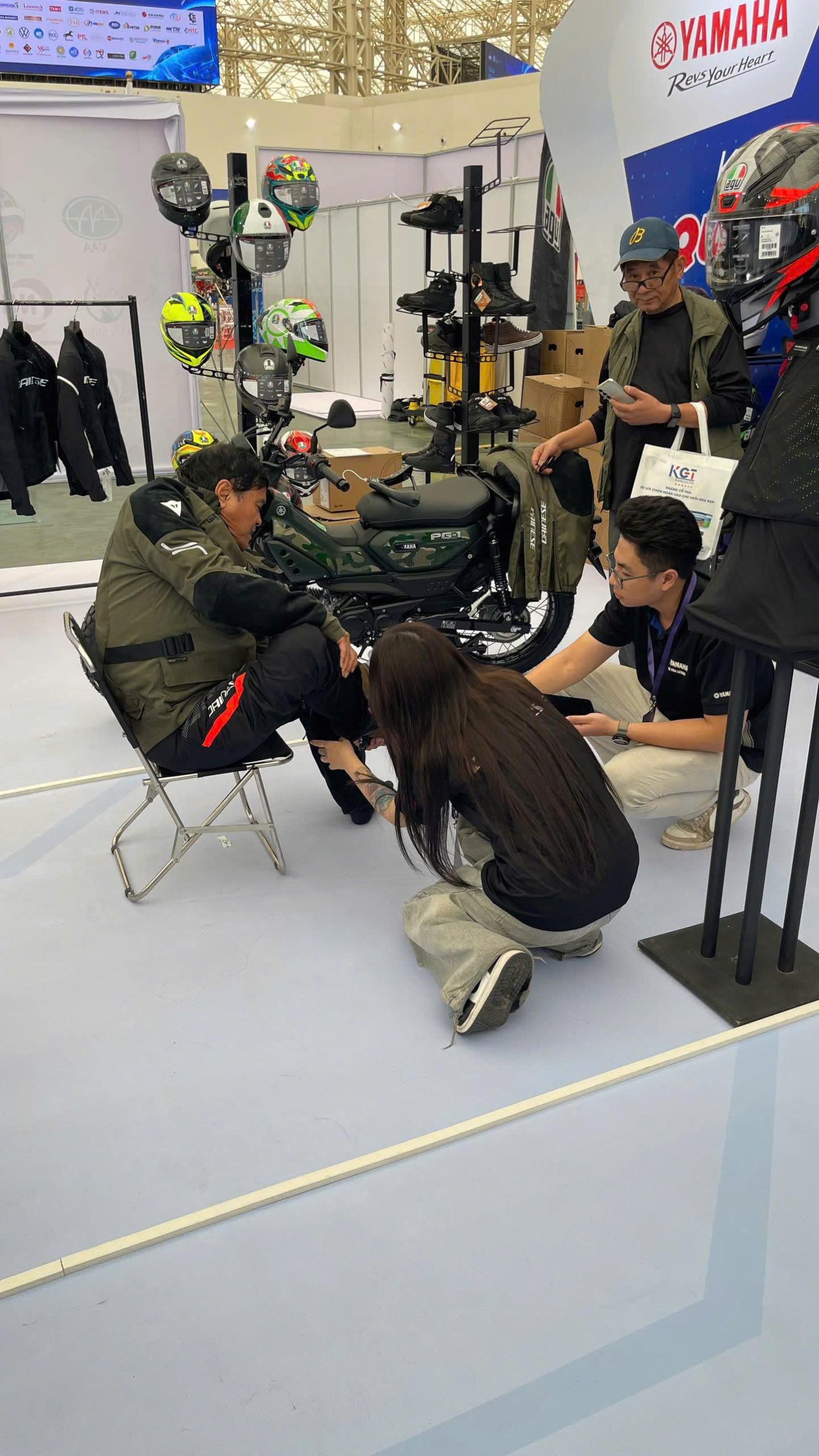 Khách tham quan được trực tiếp cầm nắm, thử form, kiểm tra vật liệu và tìm hiểu công nghệ – từ hệ thống bảo hộ tiêu chuẩn Dainese Pro-Armor, công nghệ ZPLATE và Groundtrax trên giày TCX, cho đến những mẫu mũ AGV được quan tâm nhiều nhất trong năm.